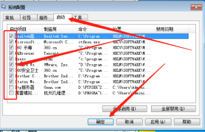 2、进入”系统配置“的界面后,选择”启动“选项卡,将不需要开机启动的软件前面的勾取消,然后点击确定;